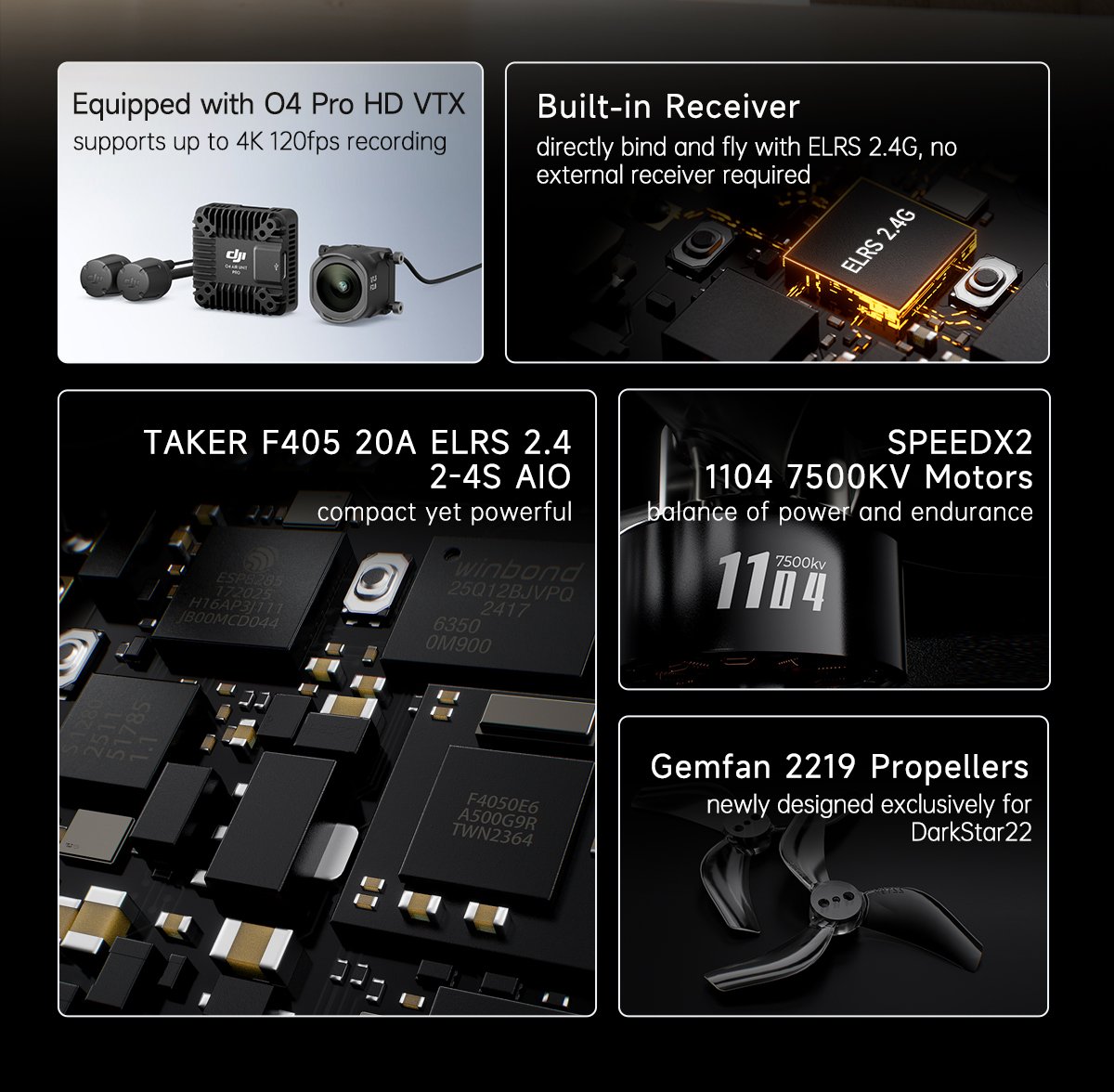 It features the latest TAKER F405 20A ELRS2.4 2-4S AIO flight controller with an integrated receiver, eliminating the need for an additional RX and ensuring compatibility with all mainstream ELRS protocol radios. The innovative five-point floating damping system provides a stable working environment for the O4 Pro gyro, enabling smooth and stabilized video output.