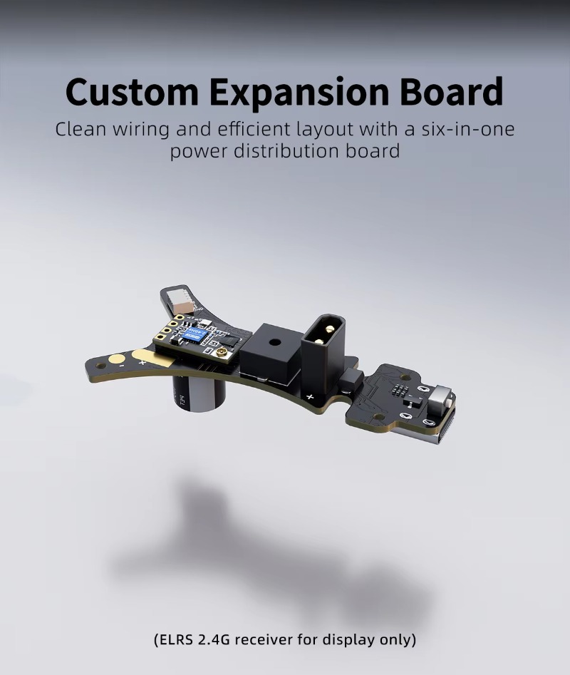 - Custom PDB with receiver, buzzer, LED BEC, TVS, and anti-spark features.