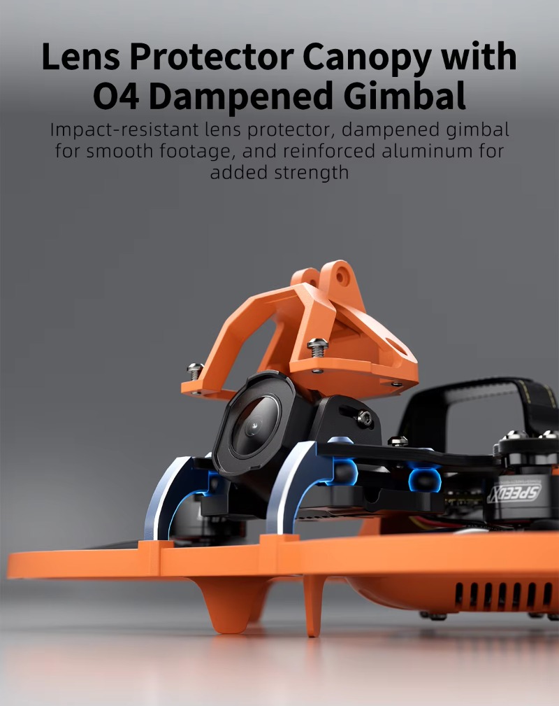 The frame is reinforced with aluminum for added strength, while the electronic compartment is designed with a wrap-around structure to protect internal components better. Dust-proof plugs safeguard the data ports, and the canopy shields the camera from impacts. The rear PDB promotes clean wiring and an efficient layout.