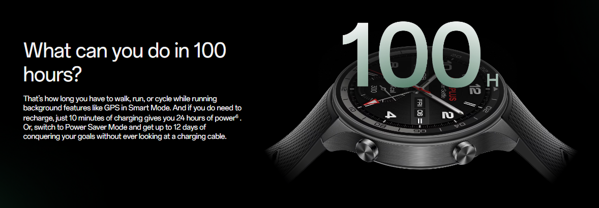 That's how long you have to walk, run, or cycle while running background features like GPS in Smart Mode. And if you do need to recharge, just 10 minutes of charging gives you 24 hours of power .