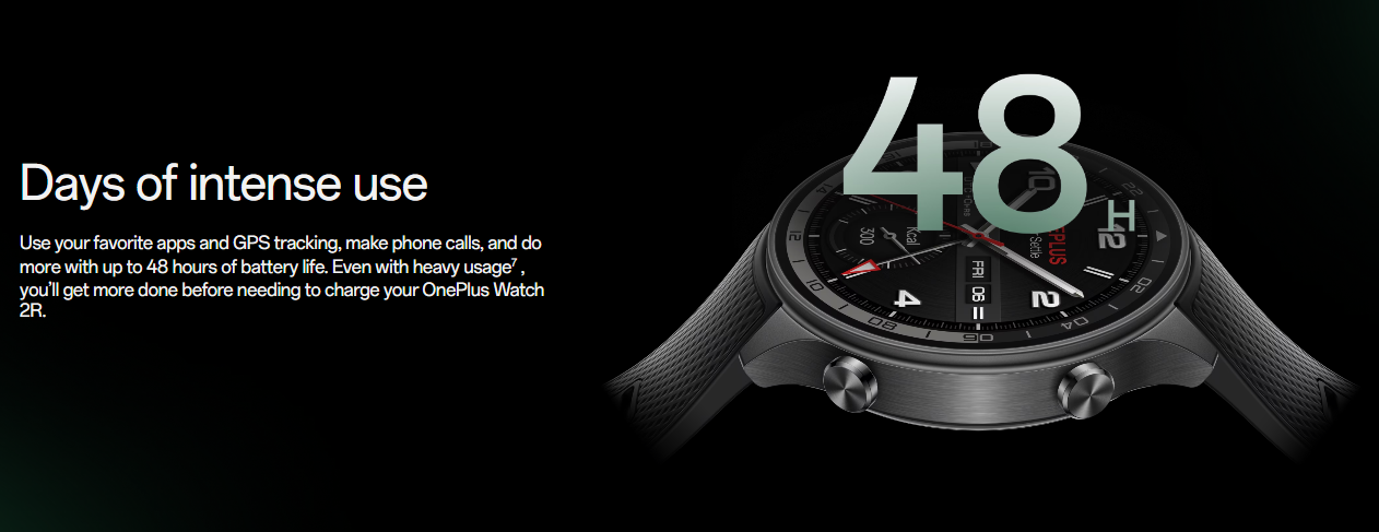 Use your favorite apps and GPS tracking, make phone calls, and do more with up to 48 hours of battery life. Even with heavy usage7 , you'll get more done before needing to charge your OnePlus Watch 2R.