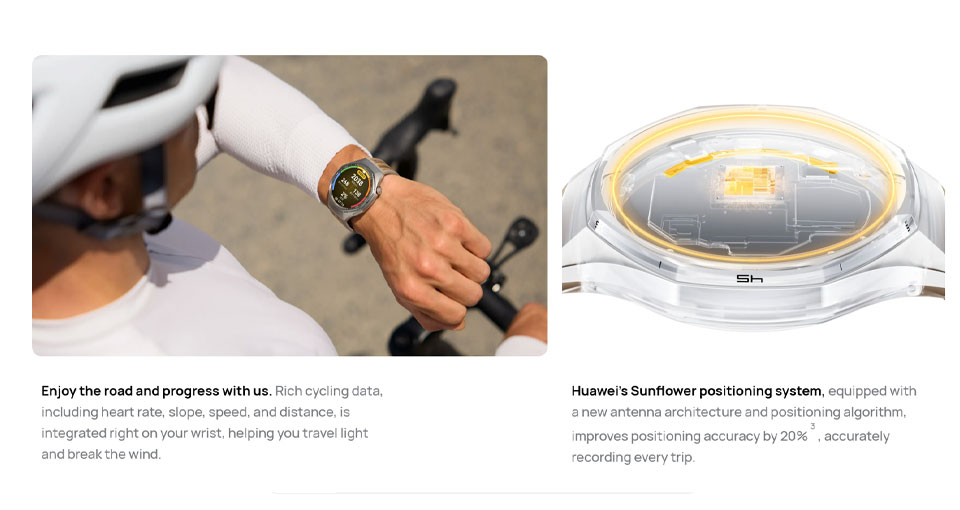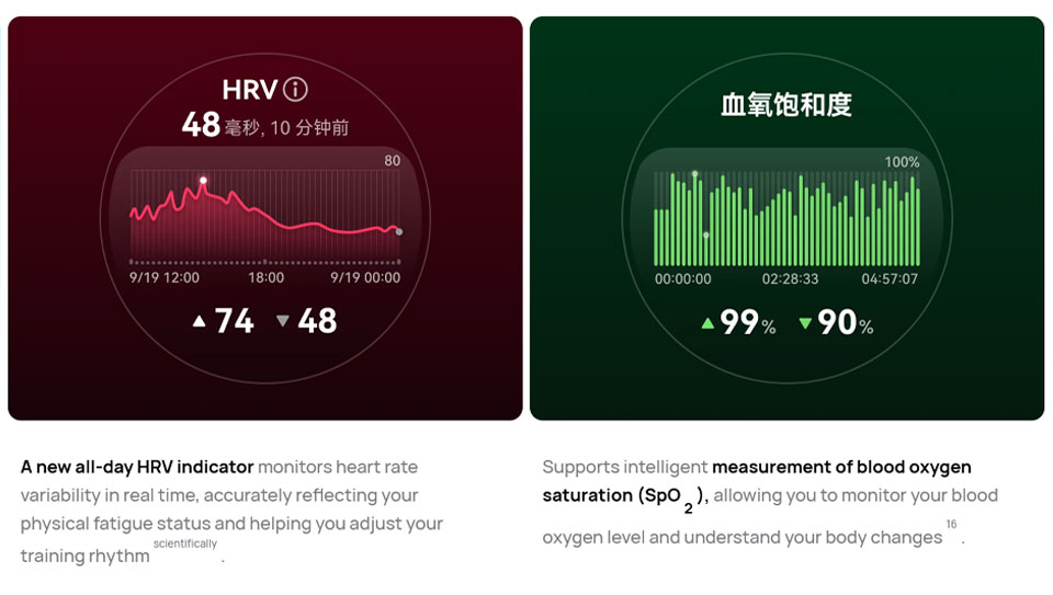 Health Features: Heart rate monitoring, automatic blood oxygen monitoring, temperature monitoring, sleep monitoring, heart health research, respiratory health research, sleep apnea research, high altitude health research, stress monitoring, female menstrual cycle management, fall detection and SOS