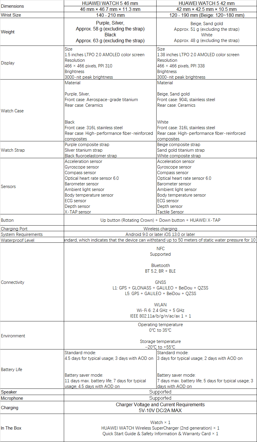Superior Materials: Aerospace-Grade Titanium (HUAWEI WATCH 5 46 mm Silver, Brown and Purple), 904L Stainless Steel (WATCH 5 42 mm Sand Gold and Beige), Spherical Sapphire Glass, LTPO 2.0 AMOLED Display. Unlock a new era of style and substance with HUAWEI WATCH 5, designed for tomorrow but fit for today. It packs Kármán line-inspired curves and futuristic tech into an iconic streamlined form that‘s as comfortable as it is revolutionary.