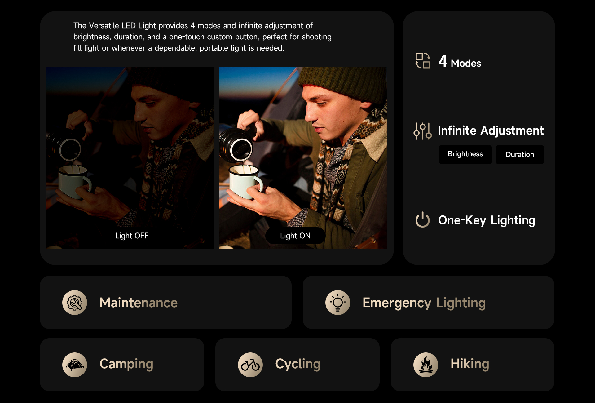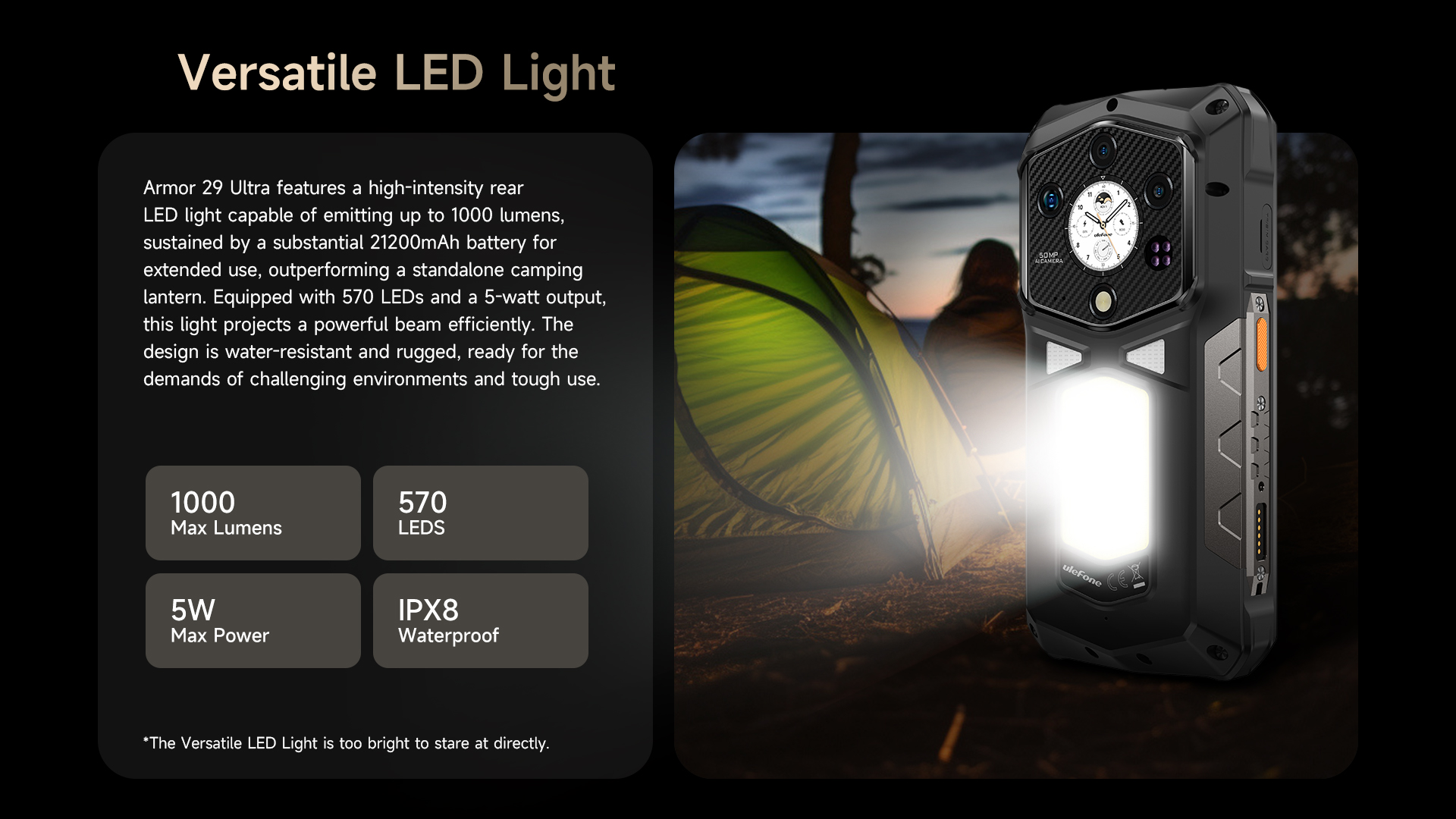 Armor 29 Ultra features a high-intensity rear LED light capable of emitting up to 1000 lumens, sustained by a substantial 21200mAh battery for extended use, outperforming a standalone camping lantern. Equipped with 570 LEDs and a 5-watt output, this light projects a powerful beam efficiently. The design is water-resistant and rugged, ready for the demands of challenging environments and tough use.