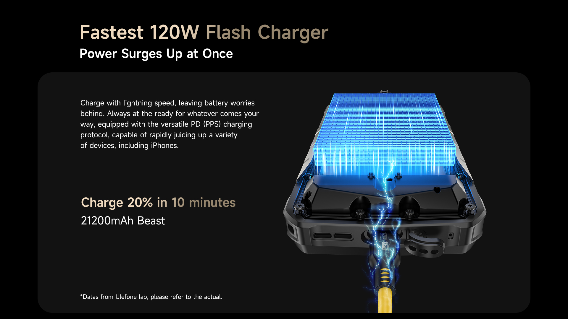 *A rated capacity of 10600mAh at 7.74V is equivalent to 21200mAh capacity. Power consumption data above are from Ulefone lab, which will be varied by actual usage.