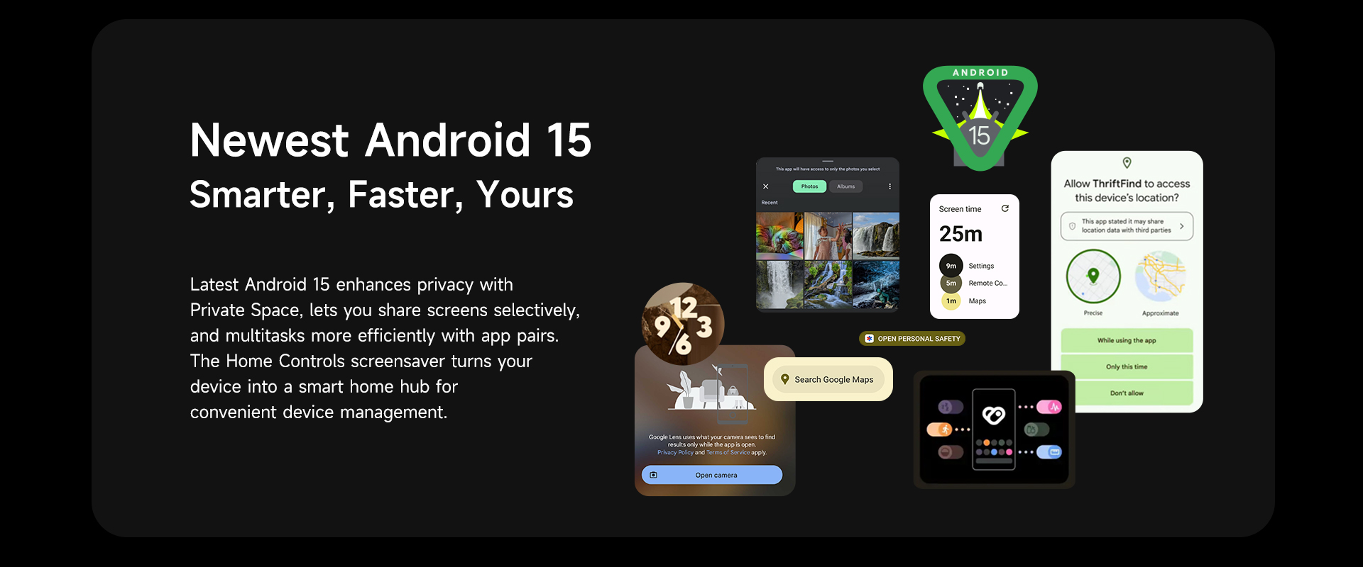 Latest Android 15 enhances privacy with Private Space, lets you share screens selectively, and multitasks more efficiently with app pairs. The Home Controls screensaver turns your device into a smart home hub for convenient device management.