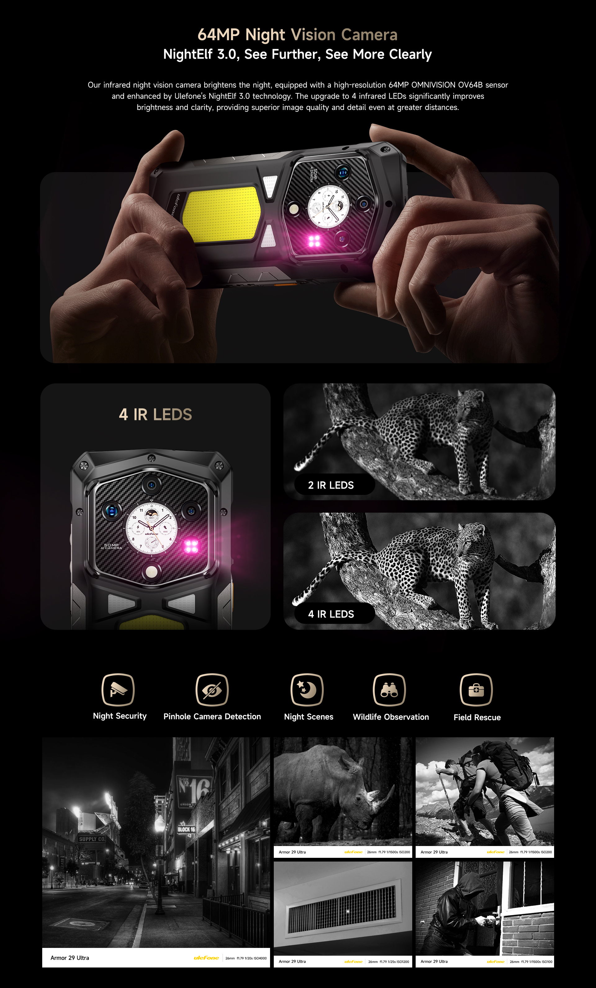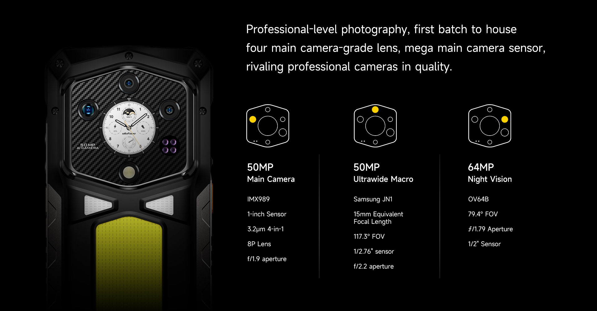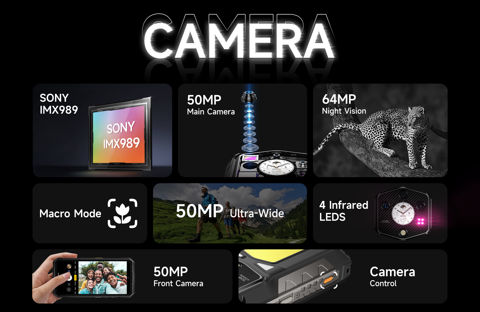 ● 50MP Main Rear Camera+64MP Night Vision Camera +50MP Ultra-wide Lens |