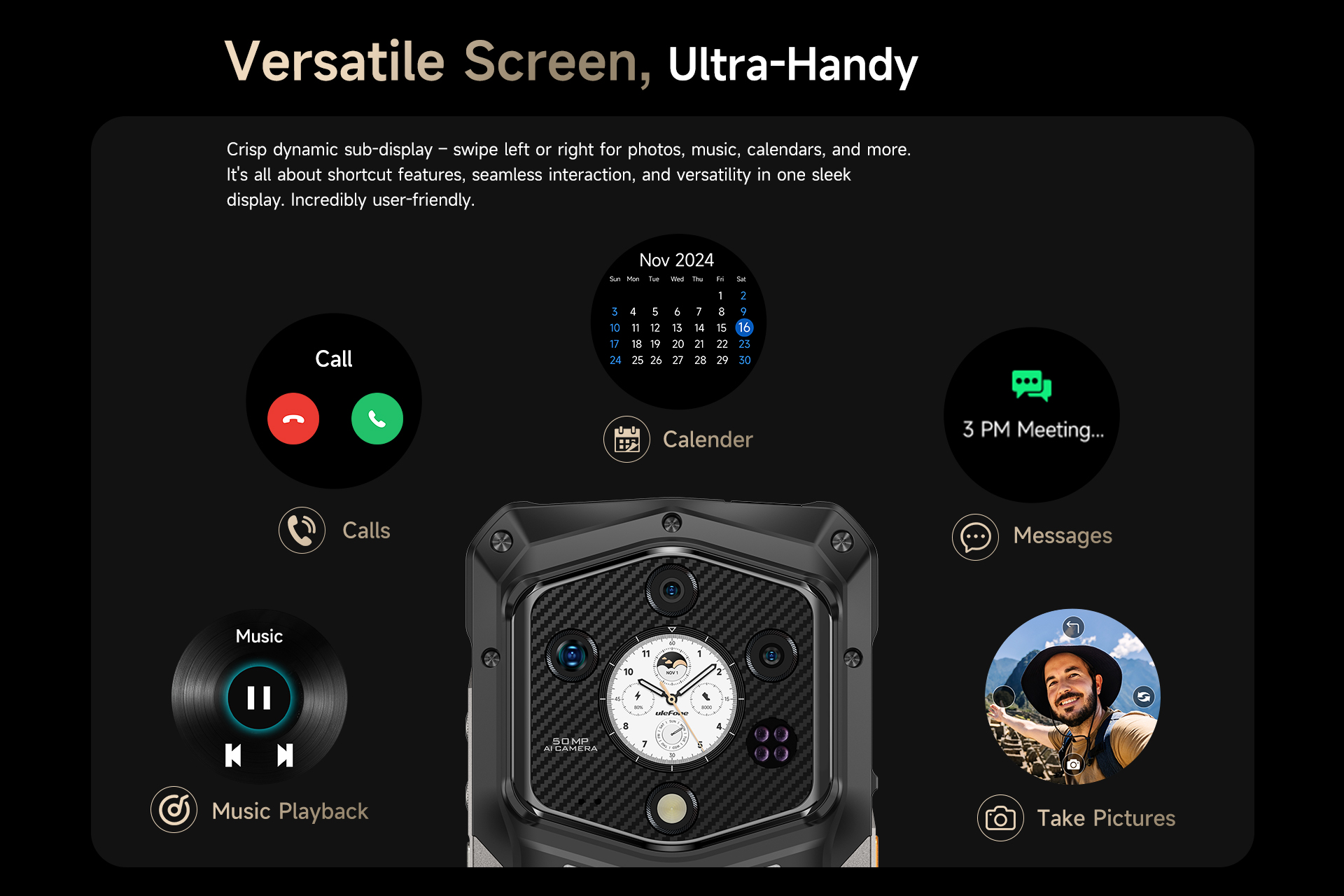 Crisp dynamic sub-display – swipe left or right for photos, music, calendars, and more. It's all about shortcut features, seamless interaction, and versatility in one sleek display. Incredibly user-friendly.
