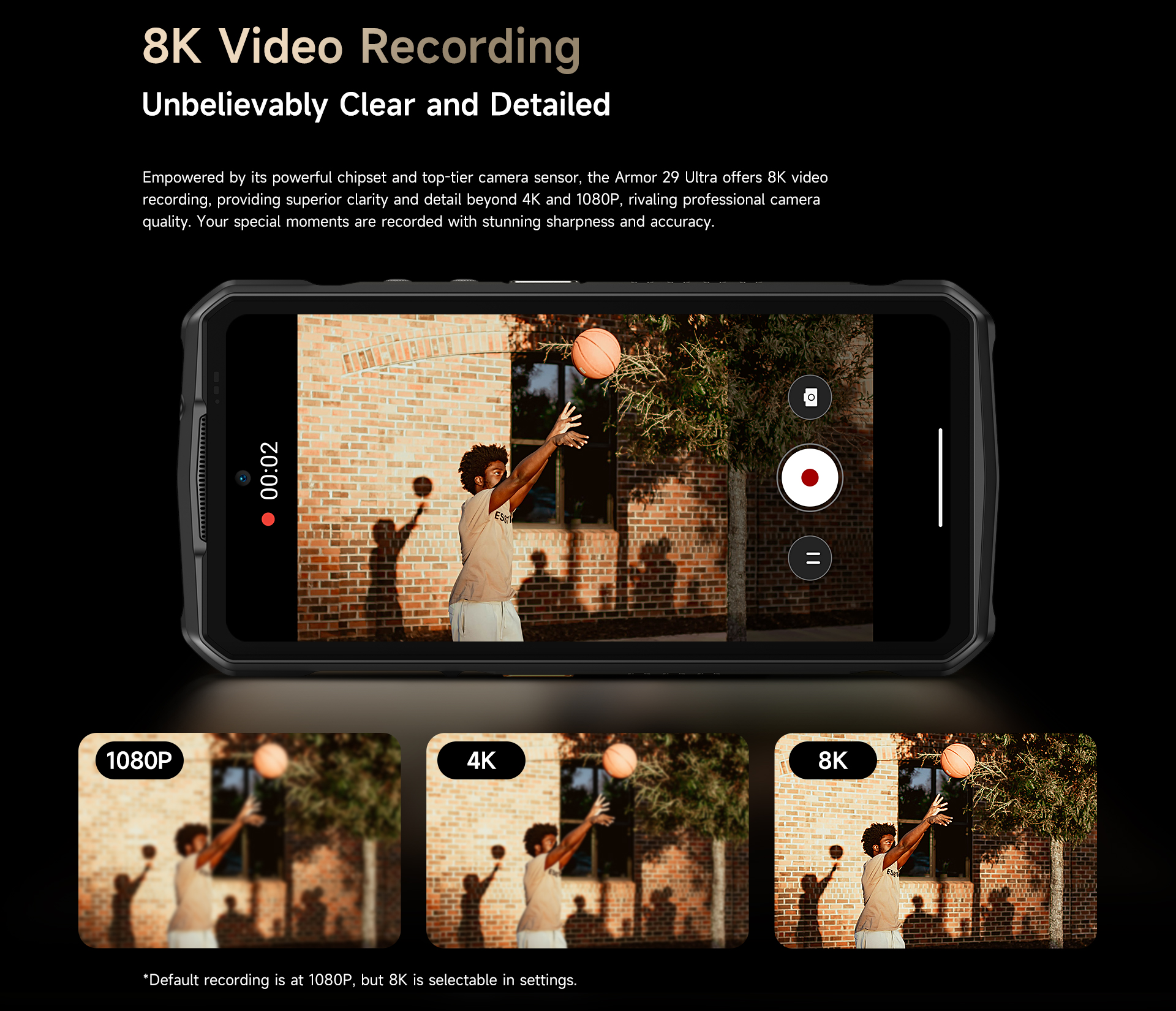 Empowered by its powerful chipset and top-tier camera sensor, the Armor 29 Ultra offers 8K video recording, providing superior clarity and detail beyond 4K and 1080P, rivaling professional camera quality. Your special moments are recorded with stunning sharpness and accuracy.