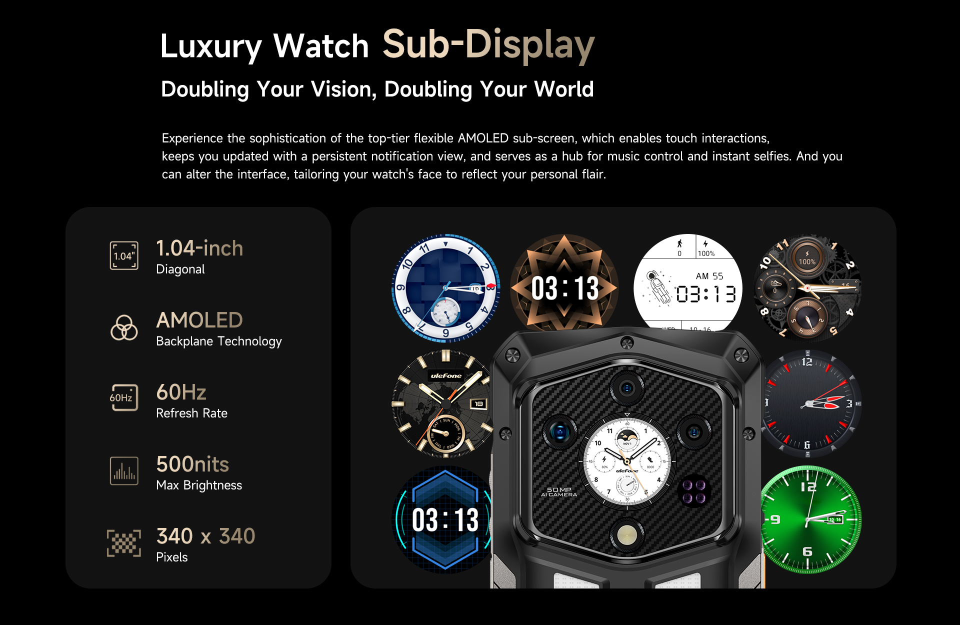 Experience the sophistication of the top-tier flexible AMOLED sub-screen, which enables touch interactions, keeps you updated with a persistent notification view, and serves as a hub for music control and instant selfies. And you can alter the interface, tailoring your watch's face to reflect your personal flair.