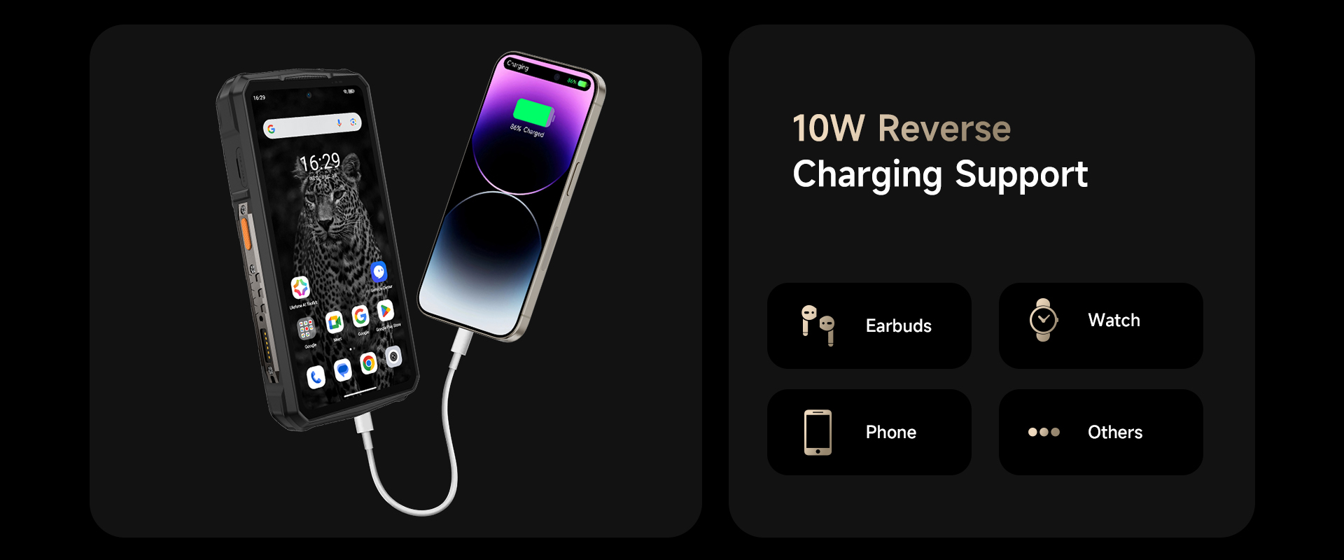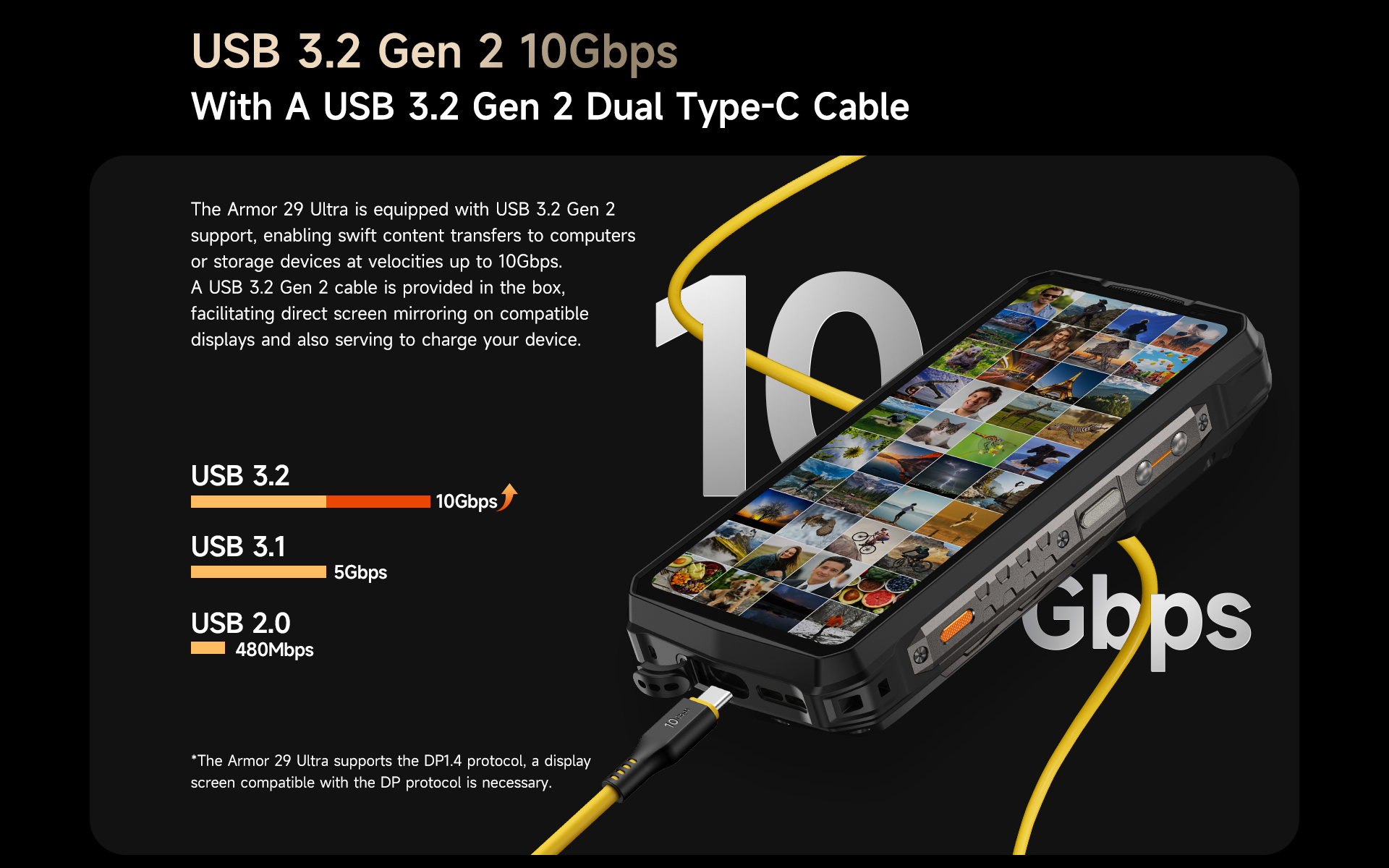 The Armor 29 Ultra is equipped with USB 3.2 Gen 2 support, enabling swift content transfers to computers or storage devices at velocities up to 10Gbps. A USB 3.2 Gen 2 cable is provided in the box, facilitating direct screen mirroring on compatible displays and also serving to charge your device.