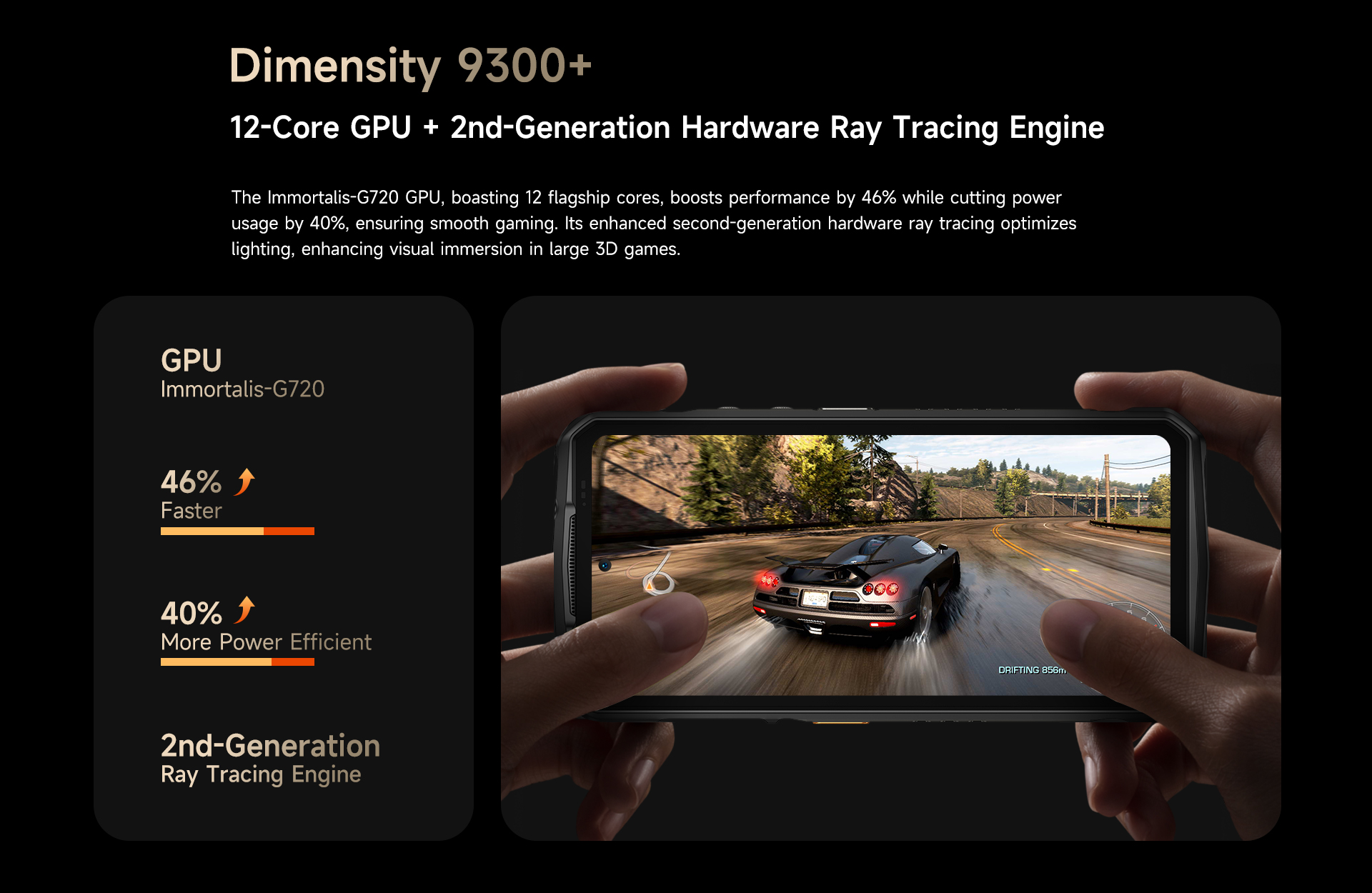 The Immortalis-G720 GPU, boasting 12 flagship cores, boosts performance by 46% while cutting power usage by 40%, ensuring smooth gaming. Its enhanced second-generation hardware ray tracing optimizes lighting, enhancing visual immersion in large 3D games.