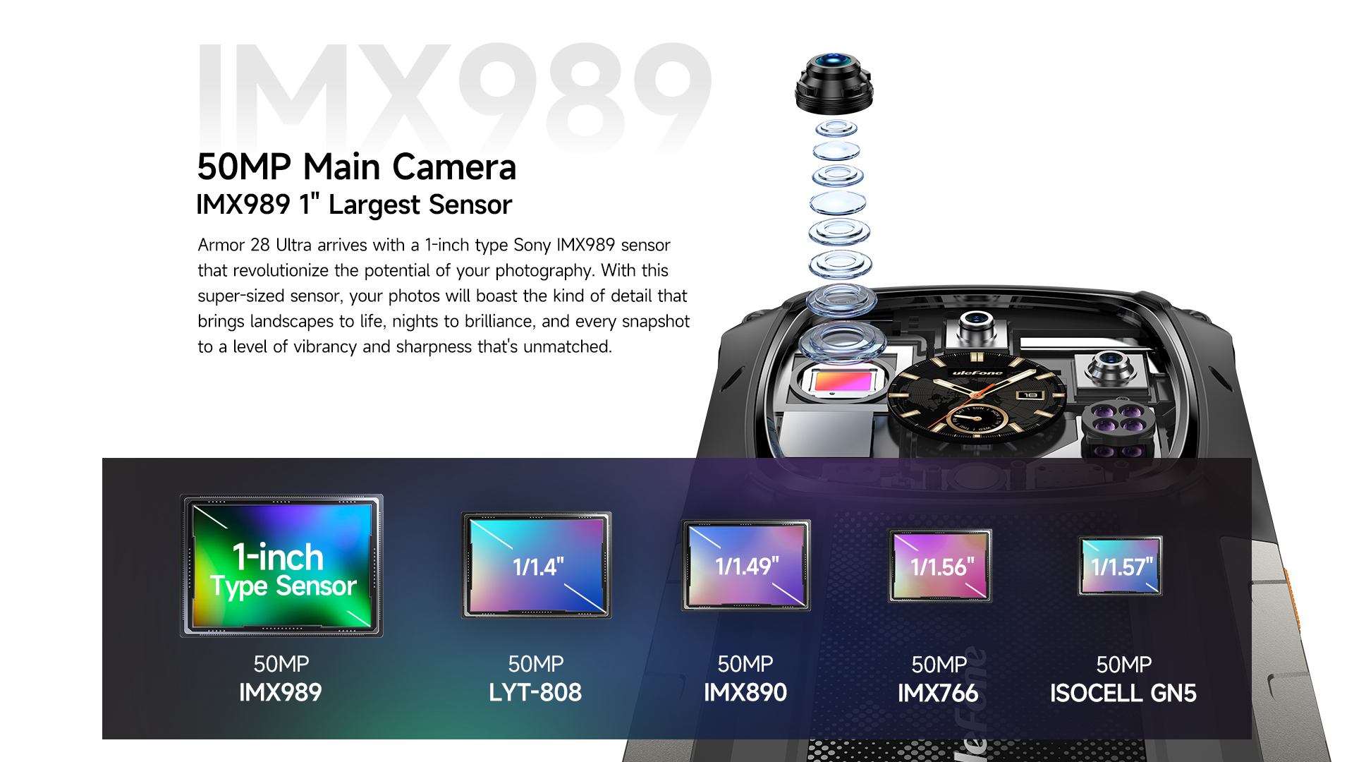Armor 28 Ultra arrives with a 1-inch type Sony IMX989 sensor that revolutionize the potential of your photography. With this super-sized sensor, your photos will boast the kind of detail that brings landscapes to life, nights to brilliance, and every snapshot to a level of vibrancy and sharpness that's unmatched.
