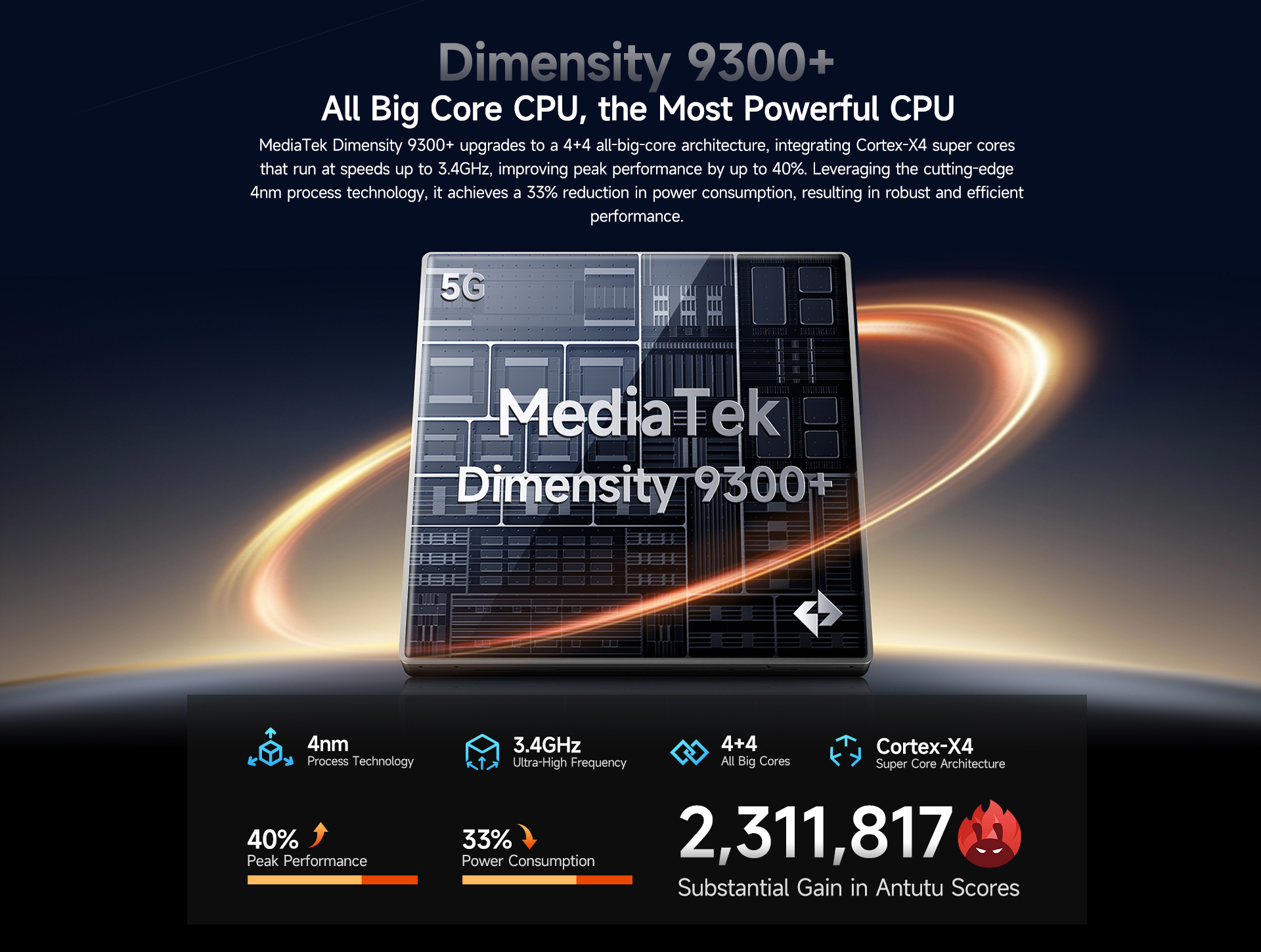 MediaTek Dimensity 9300+ upgrades to a 4+4 all-big-core architecture, integrating Cortex-X4 super cores that run at speeds up to 3.4GHz, improving peak performance by up to 40%. Leveraging the cutting-edge 4nm process technology, it achieves a 33% reduction in power consumption, resulting in robust and efficient performance.