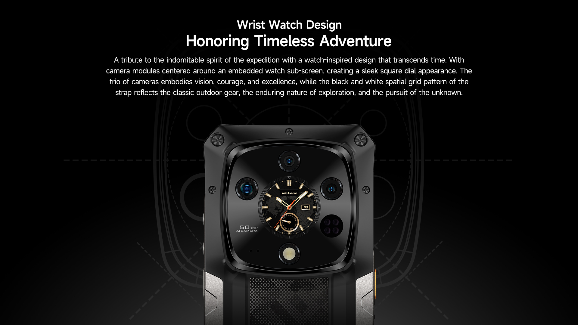 A tribute to the indomitable spirit of the expedition with a watch-inspired design that transcends time. With camera modules centered around an embedded watch sub-screen, creating a sleek square dial appearance. The trio of cameras embodies vision, courage, and excellence, while the black and white spatial grid pattern of the strap reflects the classic outdoor gear, the enduring nature of exploration, and the pursuit of the unknown.