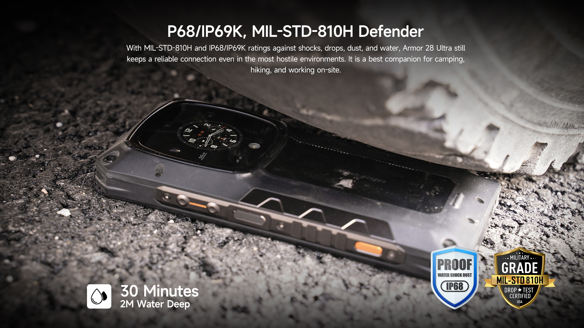 Armor 28 Ultra is splash, water, and dust resistant and was tested under controlled laboratory conditions with a rating of IP68 under IEC standard 60529 (maximum depth of 2 meters up to 30 minutes). Charger and accessories are not water-resistant. Splash, water and dust resistance are not permanent and might decrease as a result of normal wear. Do not attempt to charge a wet Armor 28 Ultra. Liquid damage not covered under warranty.